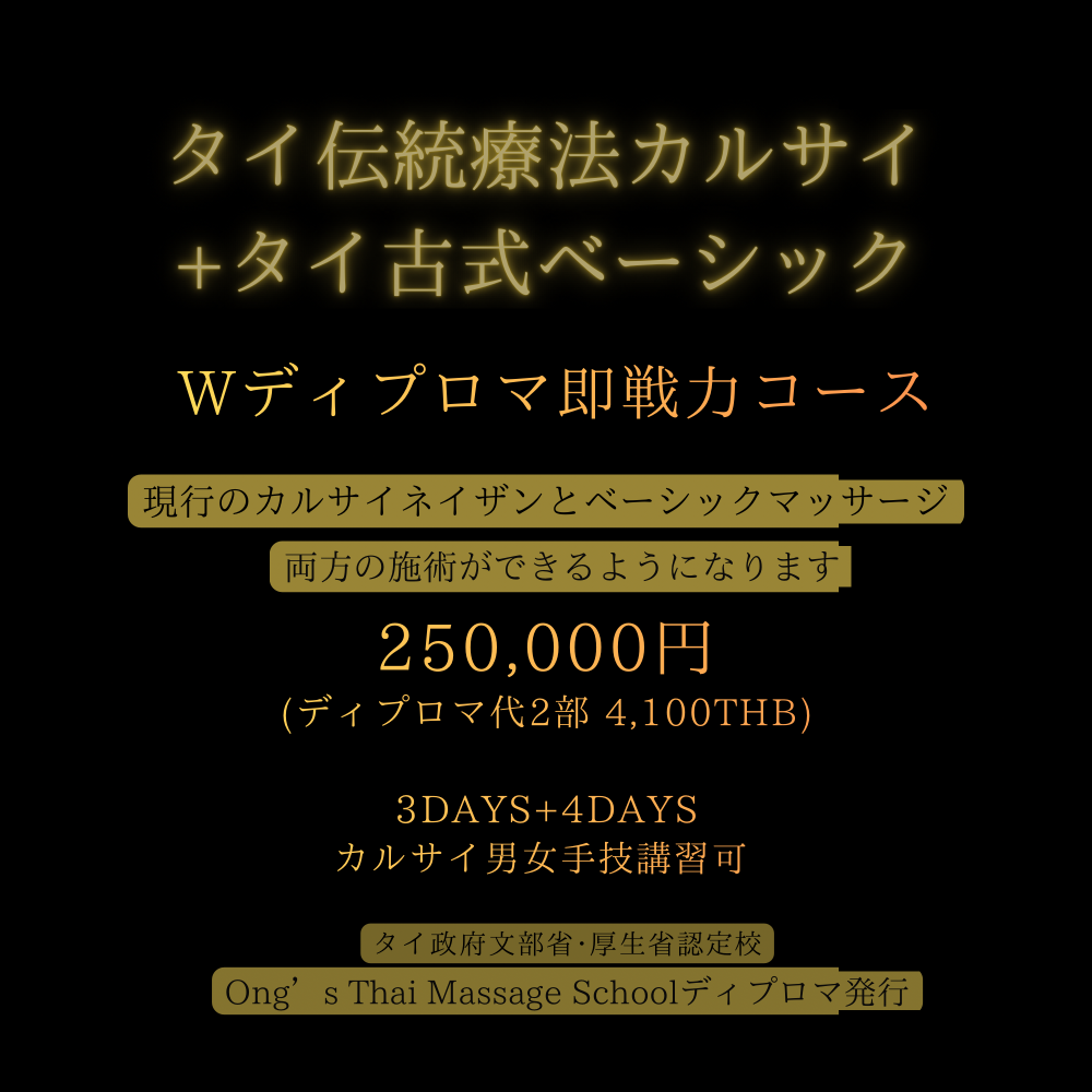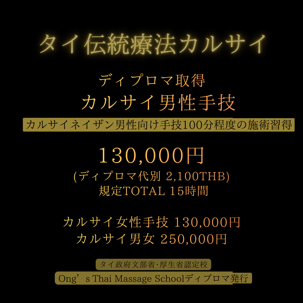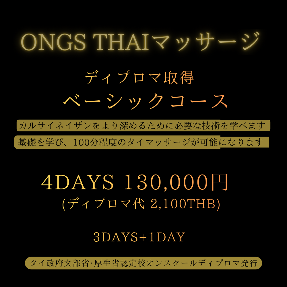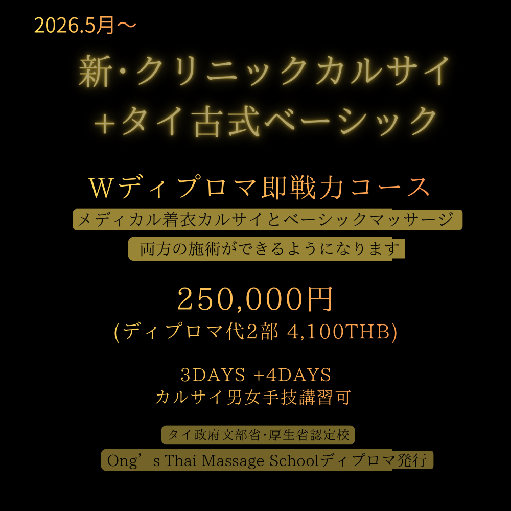 Ong's タイ本校の規約変更により、カルサイネイザン講習を受講される方や現カルサイネイザン施術者は本ベーシッククラス以上の課程修了(ディプロマ取得)が今後、必須となります。