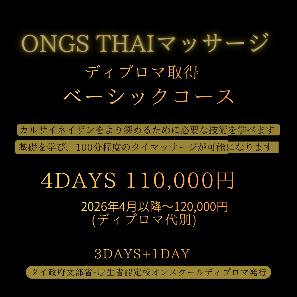 Ong's タイ本校の規約変更により、カルサイネイザン講習を受講される方や現カルサイネイザン施術者は本ベーシッククラス以上の課程修了(ディプロマ取得)が今後、必須となります。
