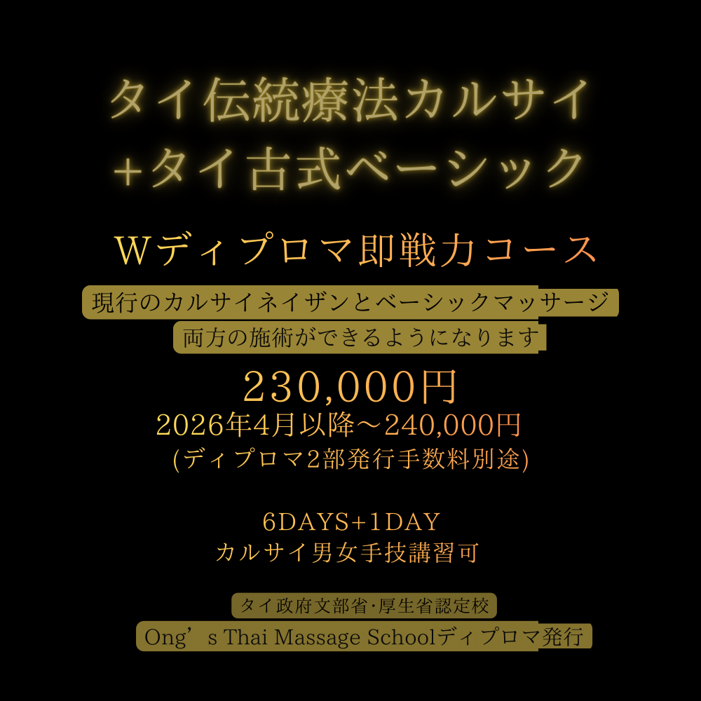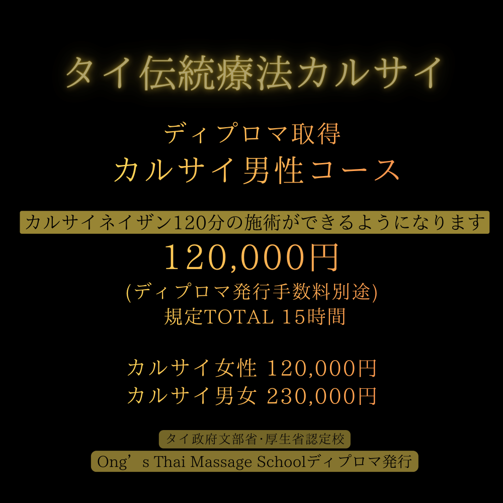 Ong's タイ本校の規約変更により、カルサイネイザン講習を受講される方や現カルサイネイザン施術者は本ベーシッククラス以上の課程修了(ディプロマ取得)が今後、必須となります。